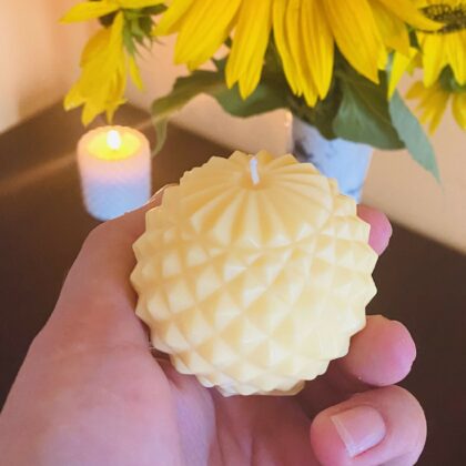 Novogodišnja jelka mirisne sveće napravljene su od sojinog voska i pamučnog fitilja. Mala sveća sadrži 80g voska, a velike sveće 180g voska. Visina velike sveće je 13cm, a širina 5cm. Visina male sveće je 9cm, a širina 5cm.